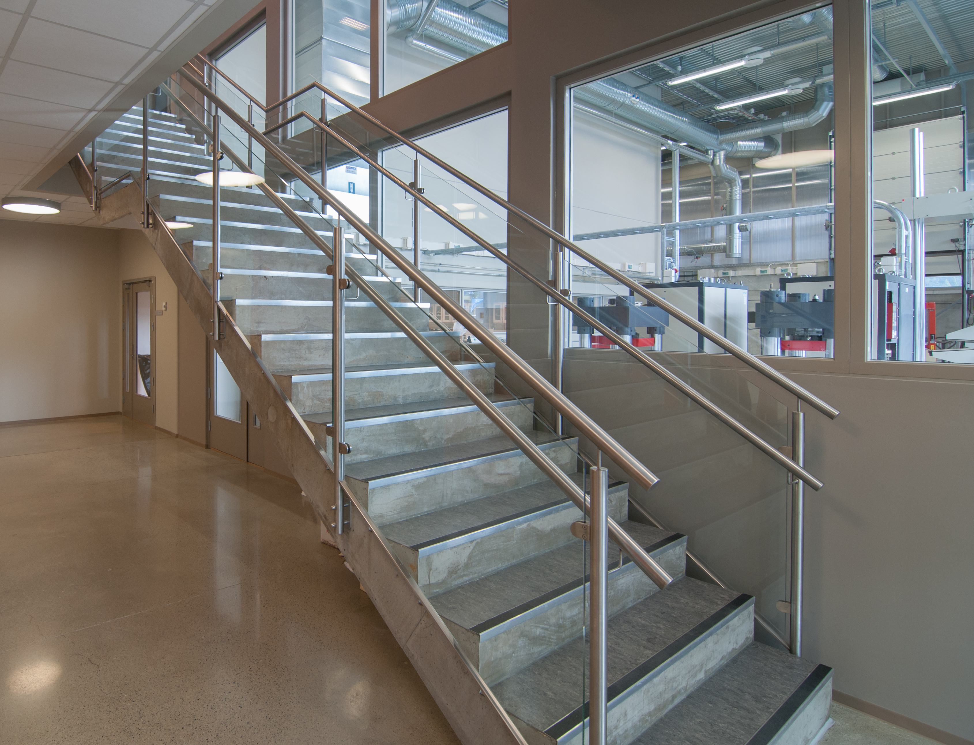 Bygget er tilnærmet rektangulært med et buet hjørne. Den østlige delen av bygget har en etasje med stor himlingshøyde, den vestlige to etasjer. To dype kar i enden av første etasje er støpt vanntett. Den bærende konstruksjon består av prefabrikkerte søyler, vegger og hulldekker, mens veggen mot nord er plass-støpt opp til vindusfeltene og isolert. De bærende søyler er trukket inn i rommet slik at vindusfeltene blir ubrutt i byggets lengderetning. Taket er en lett-takkonstruksjon som ble levert ferdig tekket og fasadene består av bindingsverk med forblending av elokserte plater av aluminium. Mot sør har bygget en stor glassfasade. Det er slipte betonggulv i første etasje og belegg på gulvene i andre etasje. Teknisk rom ligger i første etasje. I undervisningsrom og laboratorier er det etter ønske fra bruker åpne himlinger slik at studentene kan se tekniske føringer.